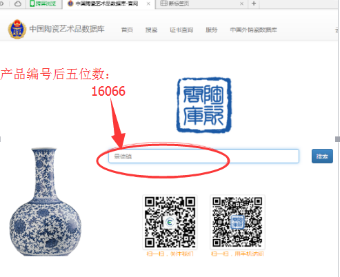 2、進(jìn)入中國陶瓷藝術(shù)品數(shù)據(jù)庫官網(wǎng)頁面,在圖二的選中區(qū)域輸入圖一中產(chǎn)品編號后五位數(shù)字“16066”,即可檢索到該編號產(chǎn)品可供對外查詢信息(每個產(chǎn)品對外可查詢一個體視顯微鏡照片數(shù)據(jù))