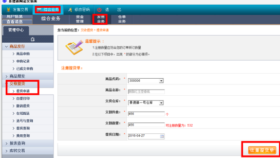 客戶端---綜合業(yè)務(wù)---發(fā)售業(yè)務(wù)---交收提貨---注冊(cè)提貨單