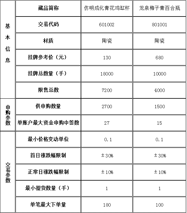 經(jīng)景德鎮(zhèn)陶瓷交易所有限公司(以下稱(chēng)本交易所)發(fā)行人會(huì)員申請(qǐng),本交易所專(zhuān)家委員會(huì)、新藏品掛牌審核小組評(píng)估審核通過(guò),對(duì)已經(jīng)完成托管入庫(kù)的2只藏品《仿明成化青花雞缸杯》 、《龍泉梅子青百合瓶》準(zhǔn)予在本交易所線上實(shí)物交易系統(tǒng)正式掛牌交易,具體事項(xiàng)公告如下: