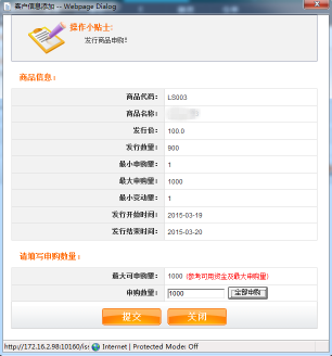點擊‘配售’按鈕,填寫確認購買的數(shù)量,提交完成配售確認。如圖2.2.1-2