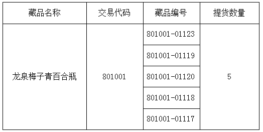 應投資人會員申請,經(jīng)本交易所對申請人信息核實以及出庫藏品復驗后,提貨藏品已完成發(fā)貨,提醒廣大投資者注意盤面藏品數(shù)量變化。提貨藏品信息如下: